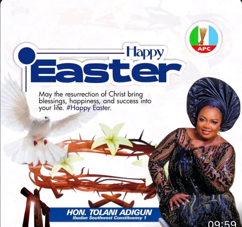 An aspirant for the Oyo State House of Assembly, Ibadan Southwest I Constituency, Hon. Tolani Adigun, has extended warm Easter greetings to residents of the constituency, urging them to embrace the virtues of hope, sacrifice, and renewal that define the season.In her Easter message made available to journalists, Hon. Tolani described the celebration of Christ’s…