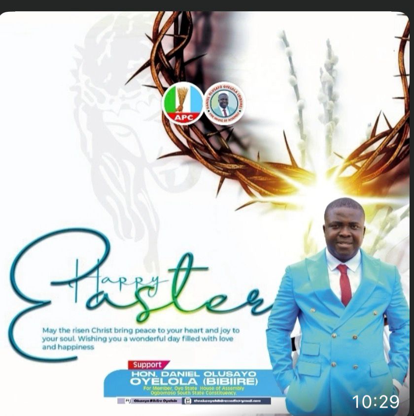 An aspirant for the Oyo State House of Assembly in Ogbomoso South Constituency, Hon. Daniel Oyelola Olusayo, popularly known as “Bibiire,” has extended heartfelt Easter greetings to residents of the constituency, calling on them to reflect on the values of sacrifice, hope, and renewal symbolized by the resurrection of Jesus Christ.In a statement made available…