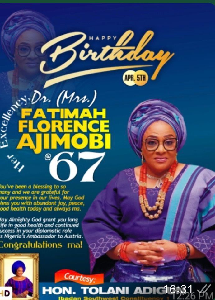 The House of Assembly hopeful for Ibadan Southwest I Constituency, Hon. Tolani Adigun, has extended warm birthday felicitations to Nigeria’s Ambassador-Designate to Austria and former First Lady of Oyo State, Dr. Mrs. Florence Ajimobi, as she marks her 67th birthday.In a congratulatory message made available to the press, Hon. Tolani described Dr. Ajimobi as a…