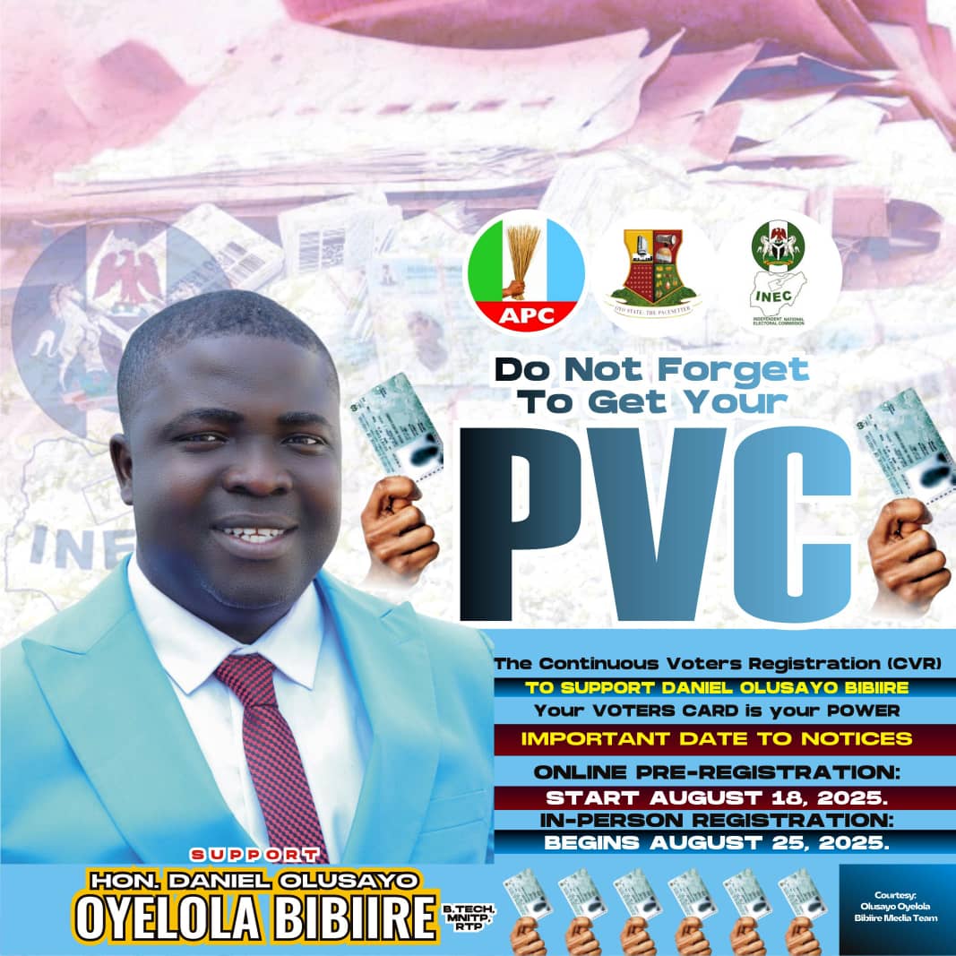Ogbomoso South House of Assembly hopeful, Hon. Daniel Olusayo “Bibiire” Oyelola, has fired up his support base and urged every eligible voter in the local government to storm INEC’s Continuous Voters Registration (CVR) centres to obtain their Permanent Voter’s Card (PVC).