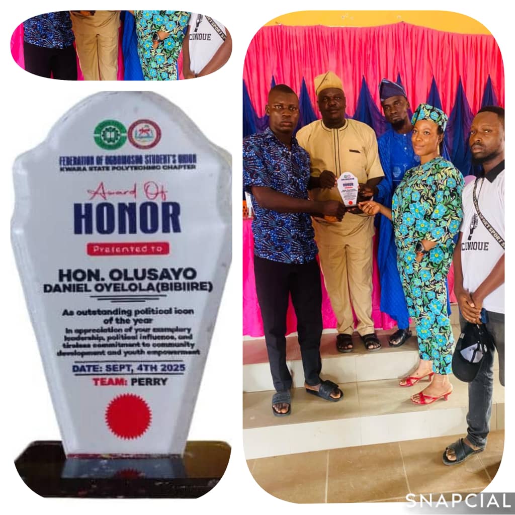 The Federation of Ogbomoso Students’ Union (FOGSU), Kwara State Polytechnic chapter, has honoured Hon. Olushayo Bibiire with a prestigious award, recognizing him as “An Outstanding Political Icon of the Year.”