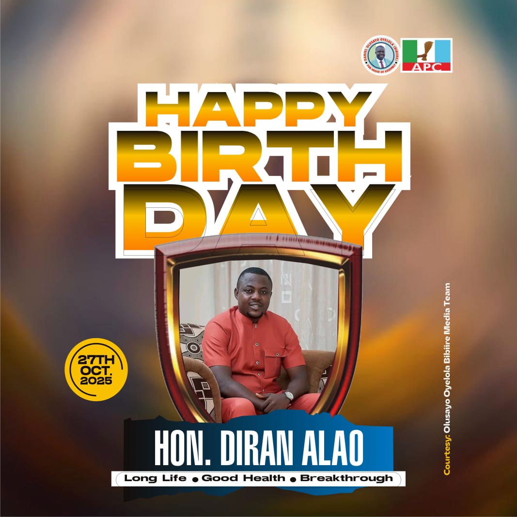 Aspirant for the Oyo State House of Assembly (Ogbomoso South Constituency), Hon. Bibiire, has joined well-wishers across Oyo State to celebrate Hon. Diran Alao, a prominent youth stakeholder and trusted ally of Senator Fatai Buhari, on the occasion of his birthday.